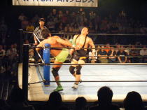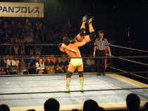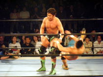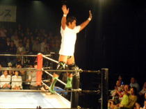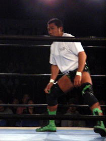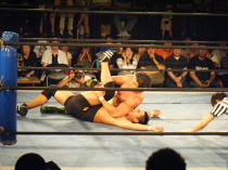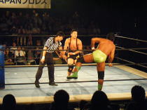 | この日は第二試合での登場。相手は前回(5月25日)の新宿フェイス大会でタッグマッチで対戦した小部卓真。 キャリアの浅い小部がどこまで維新力に対抗できるかと言うことで注目を集めたこの試合。 試合開始のゴングと同時に小部はドロップキックの奇襲攻撃から場外に叩き落す。 さらに上がってくるところにトペを見舞う。 突然の奇襲攻撃にふらふらになりながらリングインする維新力に攻撃の手を緩めない小部はコーナーロープに 飛ばしてボディアタック。 もう一度反対側のコーナーロープに飛ばしてボデッアタックを狙う。 しかし、ここで息を吹き返した維新力は蹴りで返すと、相撲ばりの突っ張りで反対側のコーナーロープに押し込み、 水平チョップ3連発。そしてボディスラムの2連発。シュミット流バックブリーカーから逆エビに行くが、ここはロープ に近くロープブレイクに逃れる。 さらにキャメルクラッチ、ベアハッグと一方的に攻める。小部の足をつかんだまま自ら場外に出てヒザを鉄柱に叩 きつける。小部も必死だ。エルボーパットで倒すとコーナーロープ最上段からミサイルキックで攻める。 ここから大技小技の応酬で激しい攻防が続く。 小部もスモールパッケージなどの技で今一歩で大金星と言う場面もあった。 しかし最後は攻め疲れした小部をバックドロップで余裕のフォール勝ち。勝ち名乗りもそこそこに足早にリングを 去っていきました。小部にとってはベテランを相手に自分なりに持てる力を発揮出来た試合だったと思いました。 今後の活躍に期待したいと思います。 |