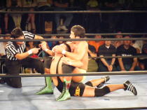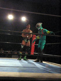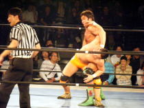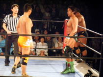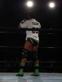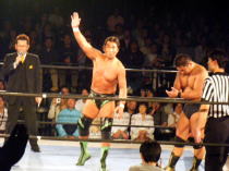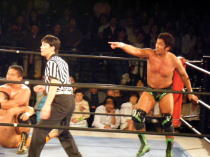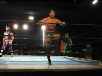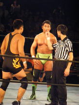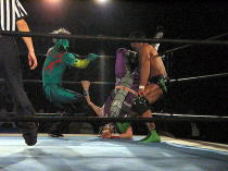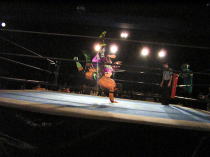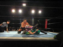 | ≪維新力参戦試合。試合レポート≫ いつもメインでの登場が多いが、今回はセミファイナルでの登場となった。 河童小僧と田島で始まる。手四つから激しい腕の取り合い。 それぞれ交代して、維新力はタケルをロープに押し込むがここはきれいにロープブレイク。 お互いロープに飛んで投げ技の応酬で館内を沸かせる。 試合は進んで、田島と河童小僧が対戦中にコーナーにいる維新力を挑発。 交代した維新力とチョップの応酬からロープに飛んでのショルダーアタックで維新力を攻撃。 しかし維新力も反撃。河童小僧と2人がかりでタケルを吹っ飛ばすとベアハッグで攻める。 さらにコーナーロープに逆さ吊りにして攻撃。やっとのことで交代した田島にも攻撃の手を緩めない。 しかし田島も二人に代わる代わるチョップを見舞い、窮地を脱出。ここから両者互角の攻防が続く。 田島が維新力をアルゼンチン・バックブリーカーで攻めるも重心を移動して巧くかわす。 河童小僧がタケルを背後から捕らえ、維新力がロープ最上段からラリアットを見舞い、 さらに突っ張りでコーナーに追い詰める。 タケルもジャーマンで河童小僧をフォールに行くが、間一髪のところで維新力がカットに入る。 最後はタケルが河童小僧をドロップキックでダメージの残るところをコーナー最上段から前方回転の ムーンサルトのような技で仕留めた。 今回、結果的には負け試合とはなりましたが、内容的には互角でとても良い試合でした。 |