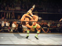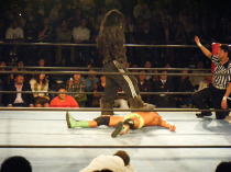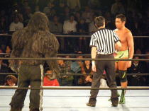 | この日の相手は、ビッグフットというヒマラヤの雪男のような衣装を身にまとっている正体不明の選手。 ゴングと同時に組み合うも弾き飛ばされる。チョップやキックを見舞うが全く効かない。 ビッグフットは維新力をコーナーに飛ばし突進するが、ここはうまくよける。 反撃に出る維新力はコーナーロープ最上段からボディアタックを仕掛けるがびくともしない。 相撲ラリアットを試みるも、これも弾き飛ばされる。 ビッグフットはボディスラムで高々と担ぎ上げてマットに叩きつける。 最後は、片足キックで叩きつけられ無念のフォール負け。 この日の維新力はまったくいい所なく敗れ去った。 |