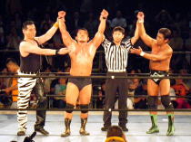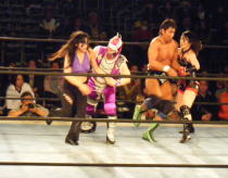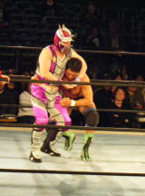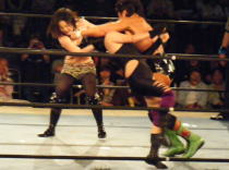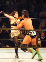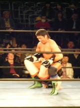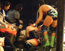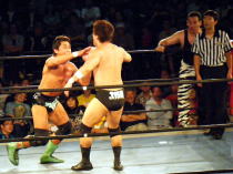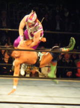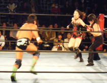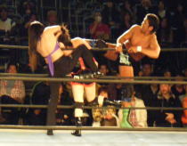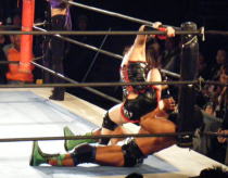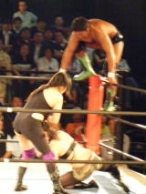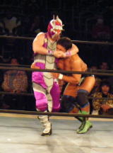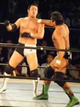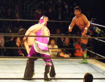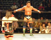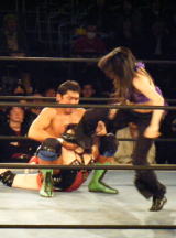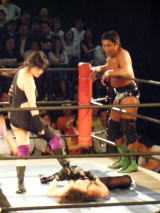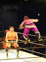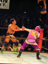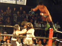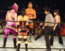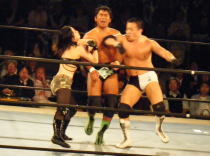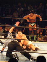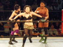 | ≪試合経過≫ 維新力が先発を買って出る。相手チームもザ・グレート・タケルが出ようとすると、維新力はアップルみゆきを指名。 しばらくにらみ合った後、維新力はみゆきに対してロープに飛べと要求。躊躇する態度を見せると再び要求。 よしとばかりにロープに飛ぶと維新力も飛ぶ。 十字を切るような形でお互い飛びあうが、ここはみゆきのトリッキーな動きに維新力はコーナーに押し込まれ顔面を 踏みつけられる。代わったタケルにも攻められつづけてしまい、開始早々から維新力の劣勢の展開となる。 タケルはヘッドロツクに捉えると、維新力はロープに振り、戻ってくるところをタイミングのいい掬い投げを決めると モンゴルにタッチ。モンゴルも勢いよく攻めるもののすぐに劣勢となる。ここでタケルはみゆきと代わる。 モンゴルは巧みにみゆきを自軍コーナーに引き込むと維新力と二人がかりで顔面を攻撃。さらにロープに目を こすりつけるなどやりたい放題。維新力に交代すると戦場を場外に求め、観客席になだれ込み一方的に攻めつける。 リングに戻すとキャメル・クラッチに捉える。モンゴルはすかさず顔面を足で押さえつける。 さらに逆エビ、ベアハッグといたぶり続ける。 やっと、タケルと交代すると維新力に猛攻。コーナー最上段からのボディアタックなどで場外に叩きだすと ブランチャーで攻める。代わったモンゴルにはコブラツイストに捉えるも維新力がカット。 最後は維新力がタケルを場外に叩きだし、孤立したみゆきにラリアットを見舞って乱戦に決着をつけた。 |