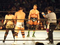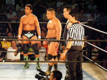 ゴング前から両チームにらみ合いとなり、いきなり場外乱闘。リングインして松田と後藤で始まる。 松田は後藤にラリアット。しかし効いた様子はない。後藤やや優勢の展開から両者それぞれ交替。 YOSHIYAは中川をエルボーパットからハイアングルのボディスラム。維新力と交替すると合体エルボーから ギロチンドロップ。 しかし維新力がつかまってしまい後藤の攻撃を受ける。黒田と替わると一転して技対技の反則なしのストロングス タイルのプロレスとなる。 維新力は松田と交替。一転して黒田と激しいチョップやキックの応酬となる。黒田は後藤と交替。すると流れは またまた一転。 松田が一方的に攻め込まれる展開となる。ラリアットからイスで頭を叩きつけられ流血。替わった中川も松田を 一方的にいたぶる。 救出に行こうとする維新力、YOSHIYAだがレフェリーに阻止される。やっと維新力と交替すると相撲流のつっぱり 攻撃からすくい投げで黒田を投げつける。 YOSHIYAも黒田を攻撃するも後藤と交替するとたちまち劣勢に。 しかし蹴りで返すと松田がさっきの仕返しとばかりコーナーからのドロップキックなどで後藤を攻撃。 しかしキャリア的に一日の長のある後藤は冷静に受け止めると再び3人が代わる代わる松田を攻め立てる。 ジャーマン、ブレーンバスター、フェイスバスターなど大技を繰り出すも松田は驚異的な粘りで耐える。 中川が松田を背後から押さえつけ、後藤がラリアットを仕掛けるがここは松田がうまく交わし誤爆を誘うと維新力と YOSHIYAはショルダーアタックで後藤をすっ飛ばす。 ここで中川に照準を絞り、維新力が後藤をYOSHIYAが黒田をそれぞれ抑え込んでいる間に松田が起死回生の ラリアットで中川からフォールを奪い、乱戦に終止符を打った。。 |