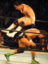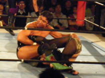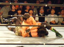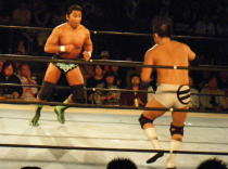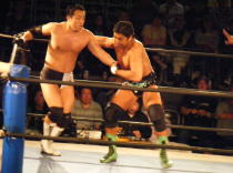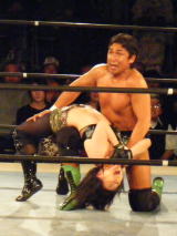 | ≪試合経過≫ 維新力と末吉で始まる。激しい腕の取り合いからロープに跳んでの攻防となる。 末吉は自軍のコーナーに連れ込むとアップルとの連携プレーで維新力にエルボーパットを見舞う。 モンゴルがフォローすると、今度は維新力との連携でそれぞれ反対側のコーナーからリング中央に相手を振り、 同志討ちを誘う。 すかさずモンゴルはアップルをロープに眼をこすりつけるなど反則を織り交ぜながら一方的に攻め続ける。 末吉がフォローにいこうとするがレフェリーに制止される。維新力も、ギロチンドロップ、逆エビとたたみかける。 モンゴルは再びフォローにいこうとする末吉を場外に叩き出すと維新力に替わってキャメルクラッチ、弓矢固めと 攻める。アップルのローンバトルが続く。維新力は、シュミット流バツクブリーカーから相撲ラリアットで攻める。 ここでやっと末吉と交替。維新力のバックから首に自分の手を回すような形で後頭部をマットに叩きつける。 替わったモンゴルにもアップルへの仇討ちとばかりにコーナーポストに頭をぶつけ、ブルドッキングヘッドロックから ブレーンバスターと攻め立てる。 維新力がレフェリーの死角をついて上手くフォローすると、両チームのタッチの回数が増えて、試合の流れが変わる。 コーナーからのミサイルキック、逆さ抑え込み、ラリアットなどお互い大技小技でフォールにいくが、決定打が出ない。 最後は意外にあっけなかった。維新力がアップルを抱えあげたところを、末吉はアップルの背中にドロップキックを見舞う。 重ね餅になるように倒れこんだ維新力をアップルはそのまま覆いかぶさるような形でスリーカウントが入ってしまった。 維新力はしたたか後頭部を強打したようで、本人もフォールを取られたのに気が付かなかったような感じで、 ふらつきながらリングを降りて控室へと去った。 一方勝った末吉組も唖然としたような表情で勝ち名乗りを受けていたのが印象に残るような試合でした。 |