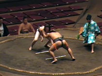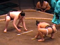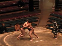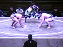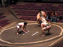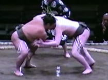 立ち会いやや左にかわりながら左手で上手廻しを深くつかむと、そのまま上手出し投げに切って落とした。 |