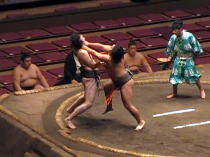 立ち会い激しい突き合いから右四つになると、上手廻しが取れない菊池は向正面に一気に寄り切られてしまう。