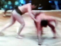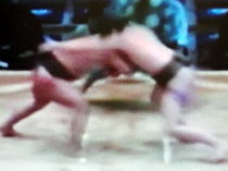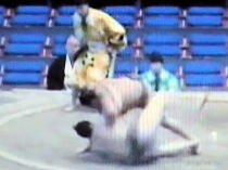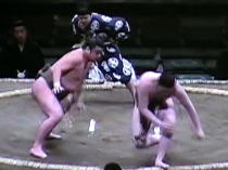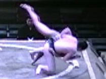 何とか左四つの体勢に持ち込むと、向正面に寄っていき最後は上手投げで勝利。 |