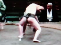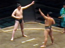 立ち会い、当たった瞬間右に回り込み、出し投げを打つような感じで突き落として勝利。 |