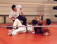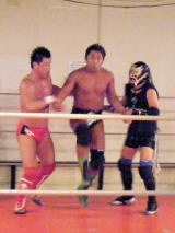 | この日、試合前に先ごろ試合中のアクシデントで亡くなられた三沢光氏と、試合後に倒れて心筋梗塞で 亡くなられたレフェリーのテッド・タナベ氏の追悼10カウントが執り行われた。 旗揚げ戦では第1試合に登場した維新力だったが、この日はメインエベントでの登場。 開始して間もなくプリンスエイトが攻撃目標にされる。 再三救出に行こうとする維新力だが、レフェリーに押し戻される。 やっとタッチした維新力は加藤に攻撃目標を絞り、コーナーに押し詰めて相撲チョップから逆エビとたたみかける。 加藤を自軍のコーナーに逆さづりにすると、プリンスエイトはさっきの仕返しとばかりドロップキック。 替わった戸田にも同様の攻撃で優勢に進めるが、場外乱闘に持ち込まれると維新力劣勢の場面も。 最後はプリンスエイトが捕まってしまい、無念の敗北となりました。 |