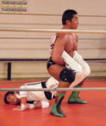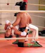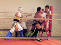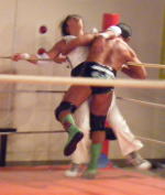 | 2009年5月31日に西調布アリーナにて旗揚げした、新しいプロレス団体「武蔵野プロレス」に維新力が 参戦しました。記念すべきオープニングの第1試合に登場した維新力。 序盤から維新力は川嵜(かわさき)を首4の字、逆エビ、ベアハッグ、キャメルクラッチなどで一方的に いたぶる。川嵜が覆面太郎と交替すると、戦場は場外へ。リングインすると維新力は覆面太郎の腕を攻撃。 この辺から展開はグラウンド中心からロープを巧みに使った立体技へと変わっていく。 維新力はこの日も18番のスモウラリアットを川嵜に見舞うなど好調だ。 やや維新力組が攻勢に進めていたが、最後はプリンスエイトが捕まってしまい、 クローズラインから無念のフォール負けとなってしまった。 |