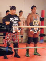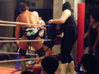 2009年6月28日(日) 「武蔵野プロレス」 場所 西調布アリーナ 試合開始18時![]() <第1試合 30分1本> 前田光世(9分26秒スタンディングアキレス腱固め)326(ミツル) <第2試合(MWA認定ジャックと豆の樹選手権)30分1本> スパーク青木(9分34秒スパークストレッチ)安倍健司 <第3試合 45分1本> ○リッキー・フジ、GOEMON、YOSHIYA(18分45秒片エビ固め)宮本裕向、星野勘九郎、川嵜風馬● <第4試合(セミファイナル)45分1本> ジ・ウィンガー(7分32秒反則)ディアブロ <第5試合(メインエベント)時間無制限1本> 加藤茂郎、戸田秀雄、○ジャングル・バード(18分36秒 鍵=0719)覆面太郎、 |